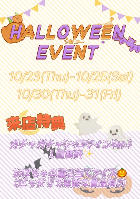 おはぽよ🌈 昨日めっちゃ寒かったね🫨 秋なさすぎて悲しいよ😢 今日も寒いのかな〜?? みんな風邪ひかないように気をつけようね🤧 さて! 本日から! ハロウィンイベントです🎃👻 女の子たちもいつもとは違った姿で出勤です🎀 来店特典として ガチャガチャ1回無料 かぼちゃの重さ当てクイズ あります!!!! ガチャガチャは毎回恒例のね🥹 かぼちゃの重さ当てクイズは 重さをピッタリ当てると いいことあります💫💫💫 ハロウィンならではの特典で一緒にたのしもう🧡💜 ご来店お待ちしております✨✨